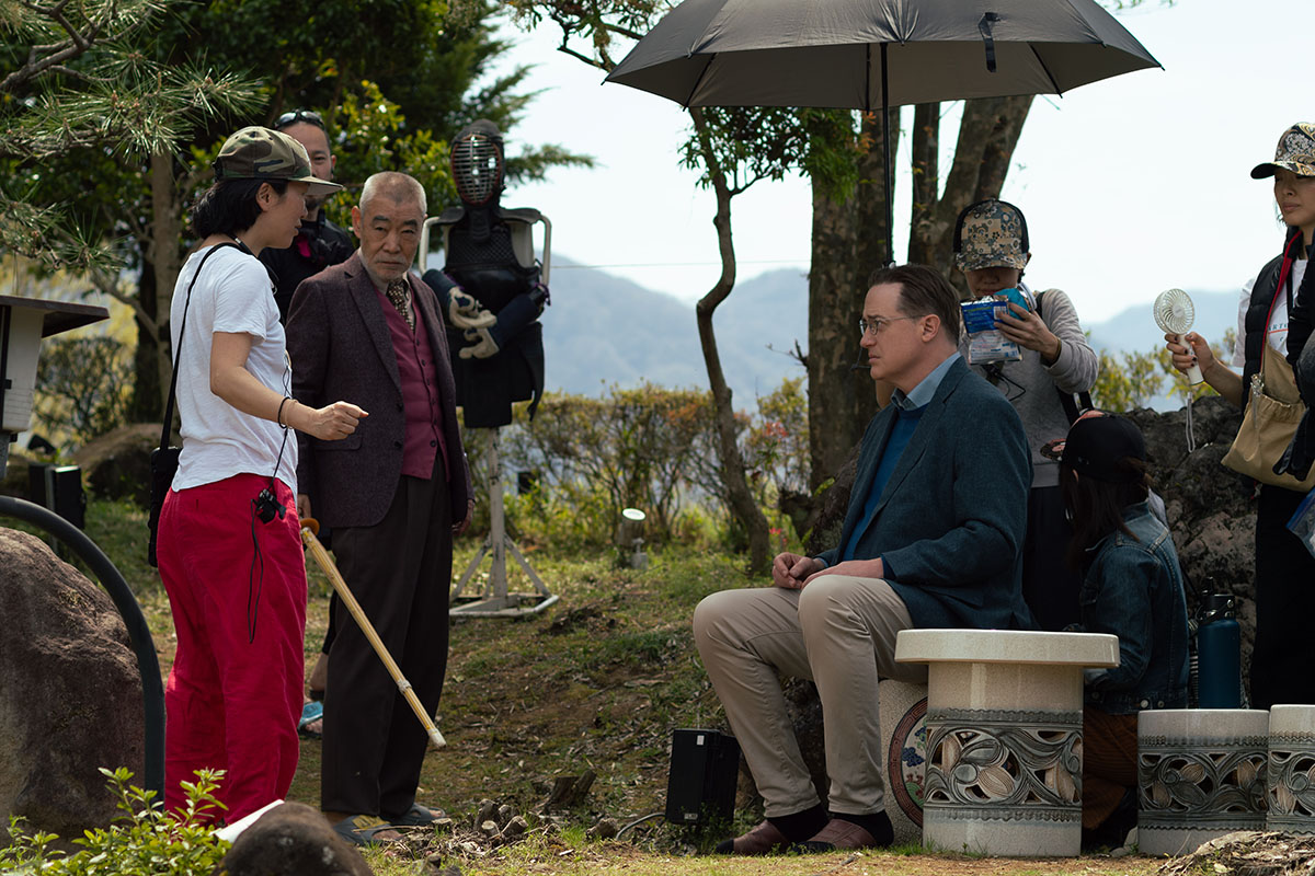 オスカー俳優のブレンダン・フレイザーも日本で長期にわたる撮影に挑んでおり、自らポケット翻訳機を手に街を歩き回り日本の町並みに溶け込むための役作りを徹底的に行ったそう。到着したメイキング画像では、満開の桜をバックにHIKARI監督と真剣な様子で打ち合わせを行っている様子や、神社の境内のような場所で撮影に臨んでいる姿が切り取られているほか、日本の名優・柄本明とともに、どこか慌てた様子で街中を歩く姿も映し出されていて、まさに日本の街中に溶け込んだ自然体の演技でフィリップを体現している姿が見て取れる。
