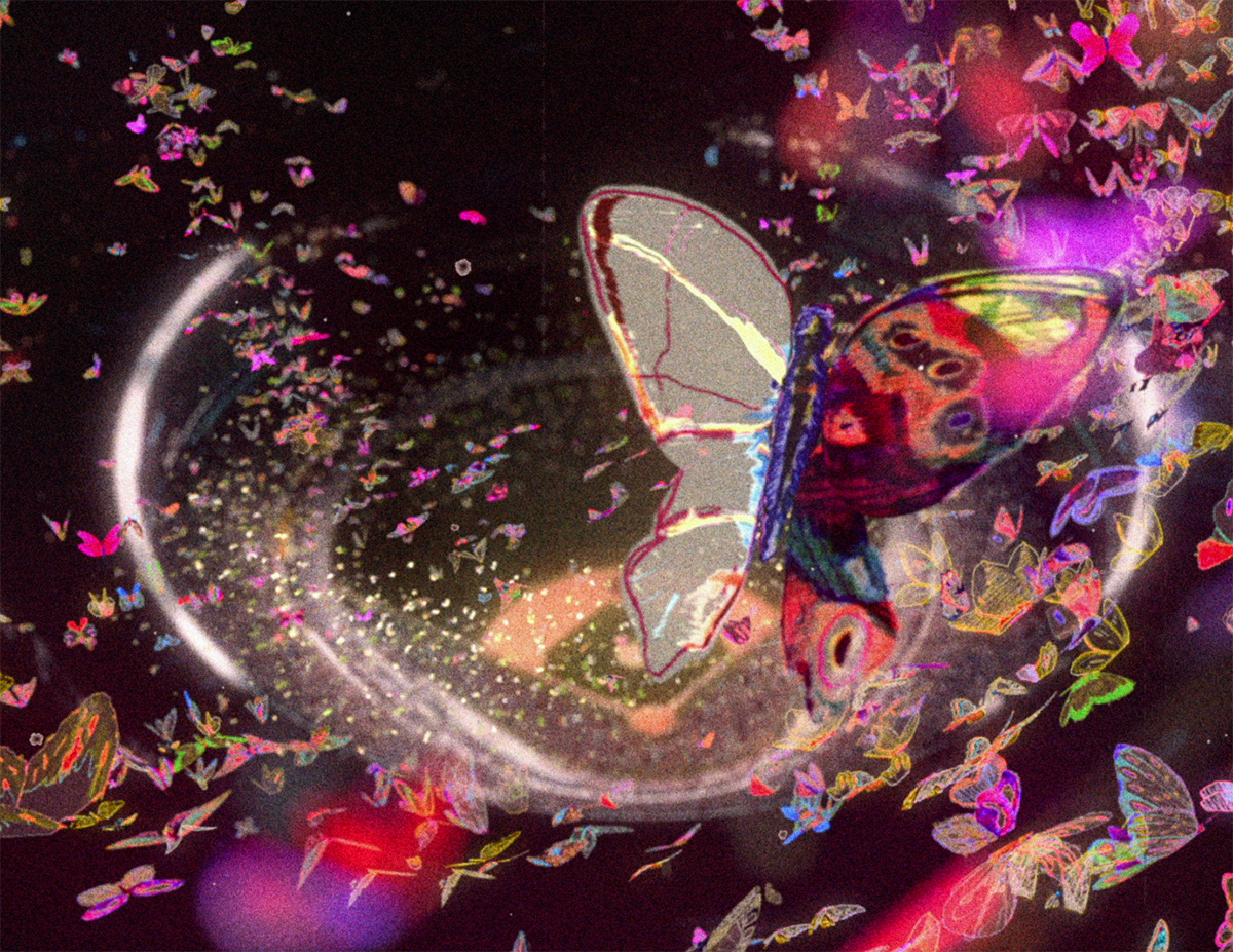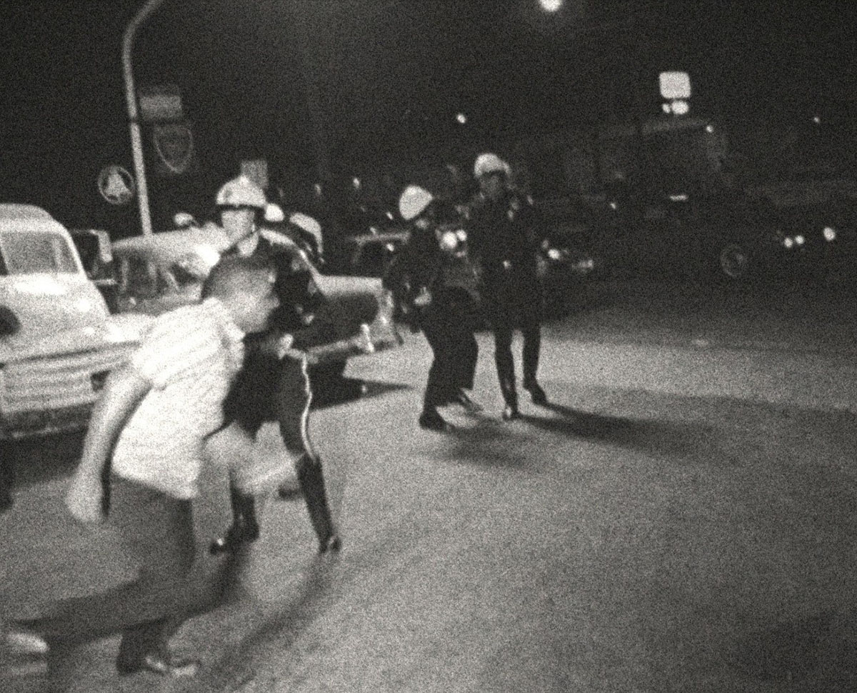続いて「作家になろうとする17歳の少年と、蝶の化身のような少女が出会った」様子として、アニメーションで本作の主人公ジェフリーが海辺で少女の姿を描く姿が映し出される。同時にスタジアムの脇で開催されている万博では、アミューズメントを楽しむ姿が。アメリカという国の力が誇示される。次のシーンでは反対に西海岸で起きた暴動の様子が映され、ストリートで歌う人の姿と、遊ぶ子供たち、音楽と共に踊る人々、華やかな万博とはかけ離れた暗部が映り、最後には撮影しているカメラを手で払う映像が入る。