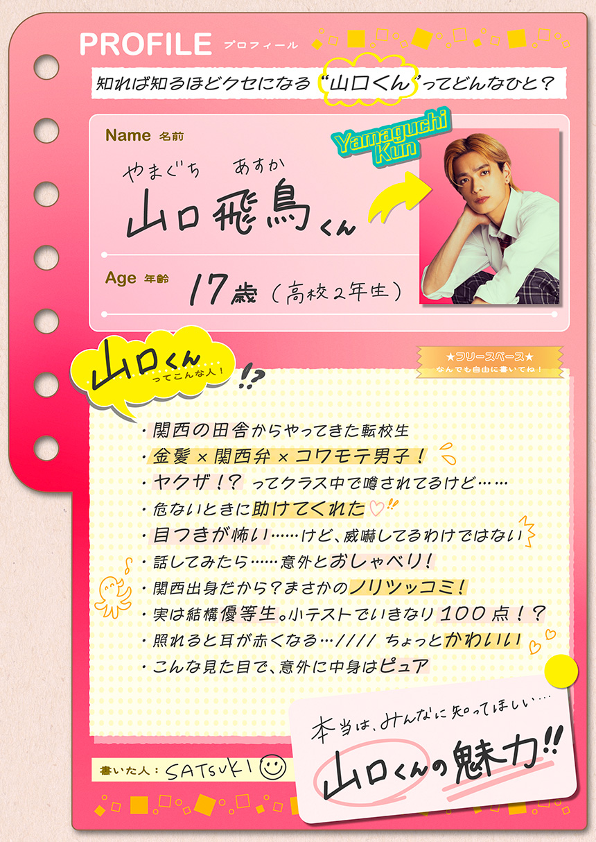 本作の原作となった少女コミック「山口くんはワルくない」(講談社「別冊フレンド」連載)は、恋に夢見るヒロイン・皐と、転校生“コワモテ×関西弁男子”山口くんとの青春ラブストーリー。“コワモテ”な見た目とは裏腹に“優しくてピュア”な素顔を持つ山口くんのギャップに、現役の学生たちはもちろん、社会人や主婦など世代を超えてハマる読者が続出。累計発行部数210万部を突破するそんな大人気作品が、実写映画としてスクリーンに登場する。